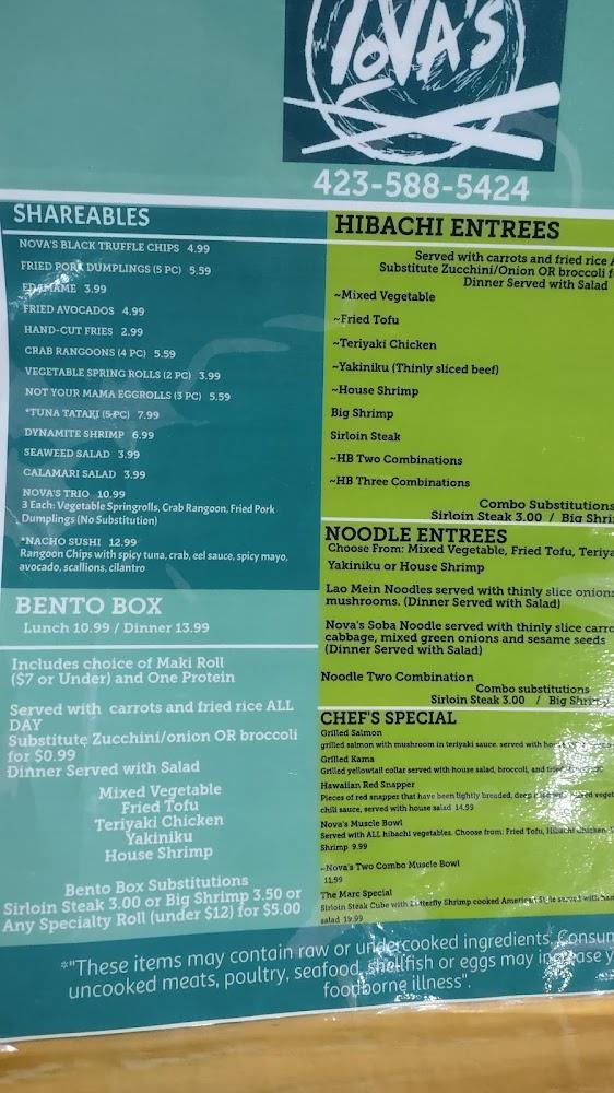 Welcome to Nova's Sushi Bar and Grille, where vibrant energy meets exquisite Japanese-inspired cuisine! Located in Greeneville, TN, our lively atmosphere is perfect for sushi lovers and food enthusiasts alike. Indulge in inventive sushi rolls, refreshing cocktails, and a diverse selection of teas, all served with exceptional speed and a smile. Whether you're savoring a quick lunch, enjoying a dinner with friends, or relaxing solo, our accessible seating and delightful offerings cater to everyone. Discover the fun and flavor at Nova's—a must-visit for both locals and tourists seeking a unique dining experience!